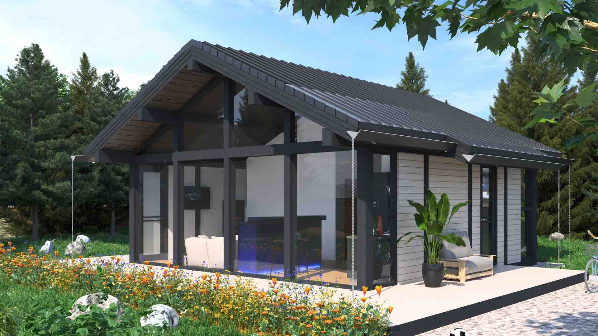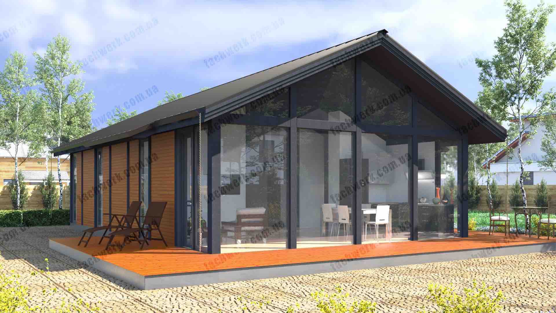 Фахверковий будинок у стилі А-Фрейм. Висока сейсмостійкість. Чудово впишеться своєю архітектурою в лісі, горах, чи на березі озер. Прекрасний варіант для комерційного застосування в рекреаційних зонах відпочинку.