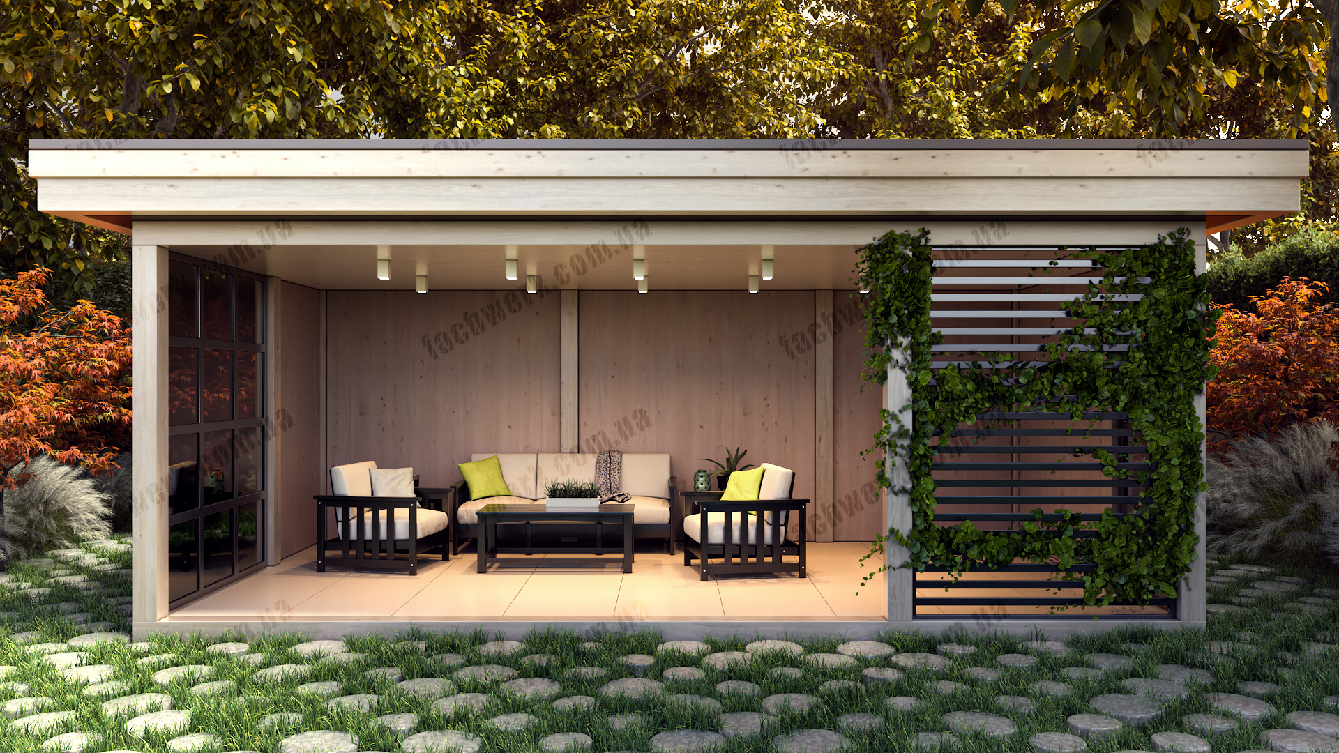 - Стильний та вмісткий садовий будиночок, в якому є можливість відпочити як на веранді, прийняти гостей тощо.